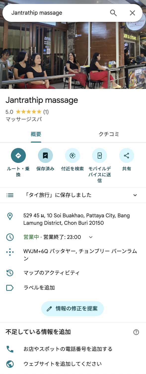 今回行ってきたのはSoi Patayasaisongというマッサージ通りにある「Jantrathip massage」です。比較的な大きな通りにあるので、まず迷うことはないと思います。